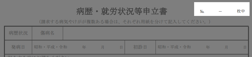 右上の「No. – 枚中」には、病歴・就労状況等申立書が複数枚になった場合に記入が必要です。