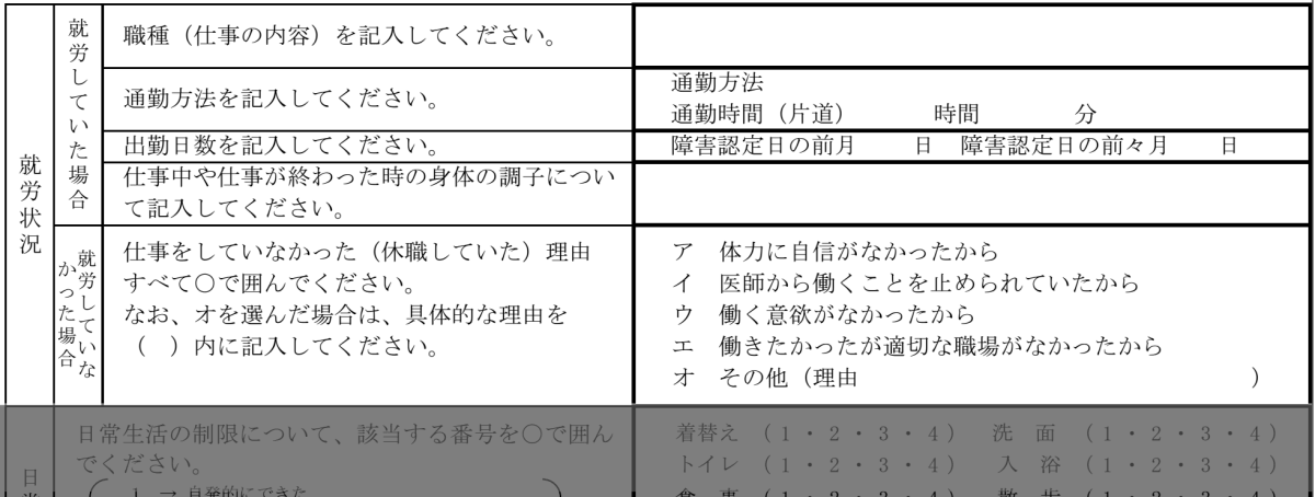 医師の作成する診断書と重複する項目もありますが、こちらはご自身やご家族の認識している日常生活や就労・通院歴などを請求者(またはその代理人)が記入します。
