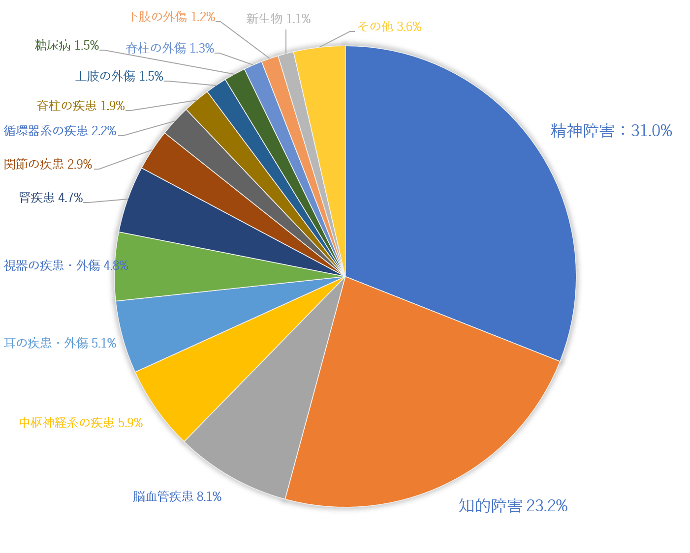 さらに、障害年金の受給者を傷病別で分けたとき、精神障害はもっとも多く、31%となっています。