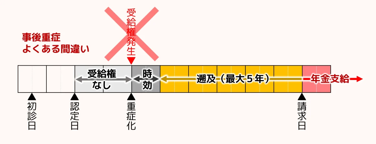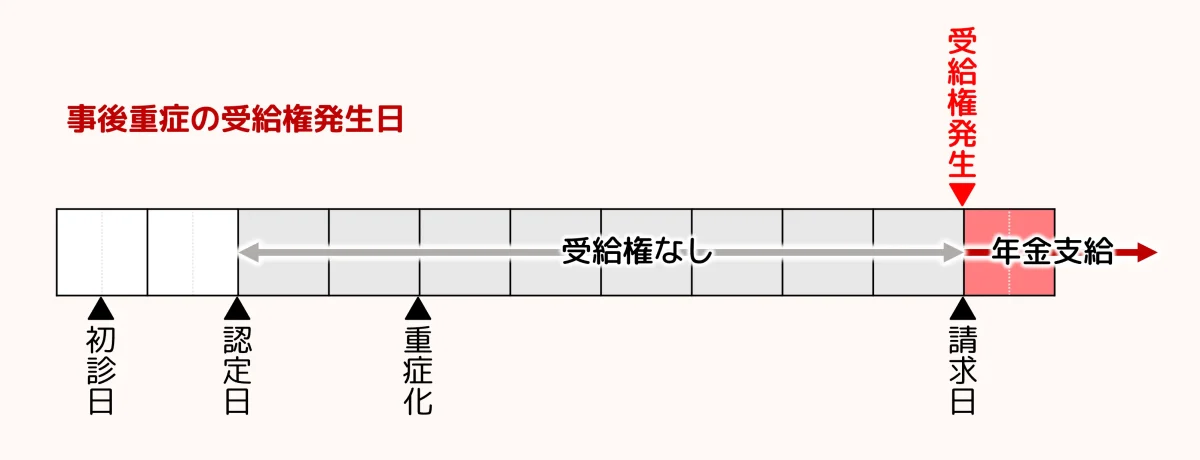 事後重症請求は請求日から未来に対してのみのもので、過去に重症化した状態の頃までさかのぼって年金を受給することは不可能です。