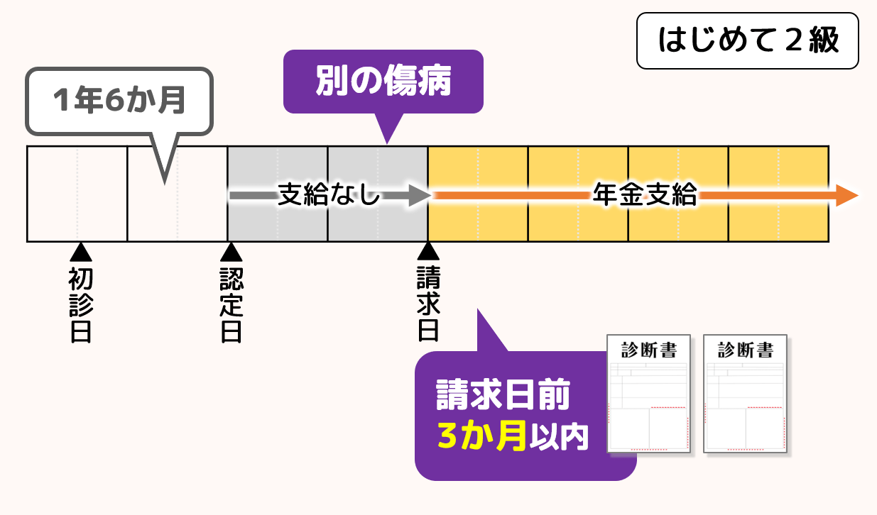 はじめて2級の請求とは、障害等級が3級以下の障害を持っていた方が、最初の障害とは別の傷病を併発し、後発の傷病の状態と併せて2級に該当する場合に行うことができます。