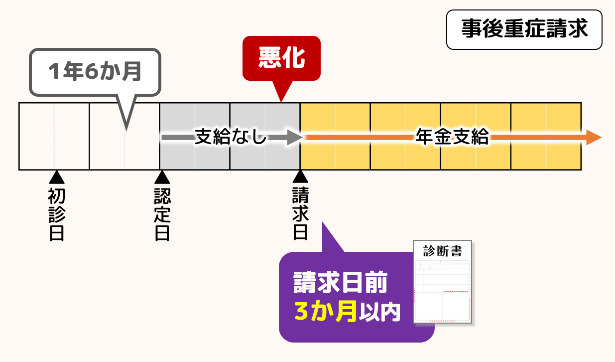 事後重症請求とは、障害認定日には障害の状態にあると認められなかったけれども、その後に病状が重症化したことによって、障害認定基準に該当するようになった場合に可能となる請求です。