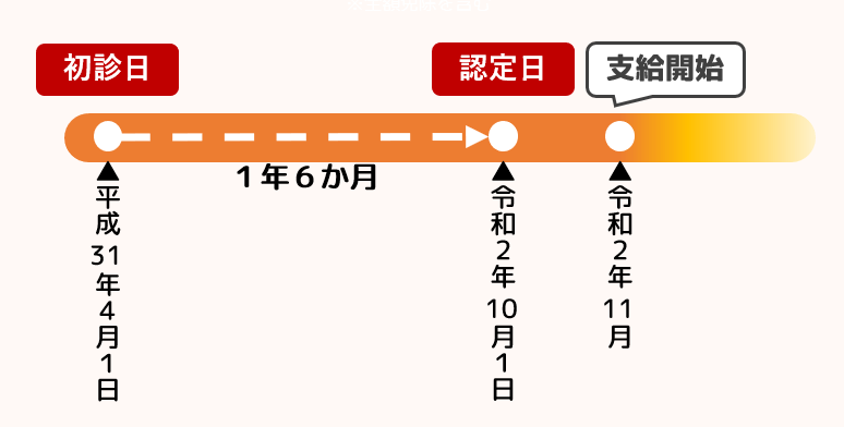 障害年金の受給は、認定日を含む翌月分から支給されますので、この場合は【令和2年11月】から支給されるということになります。