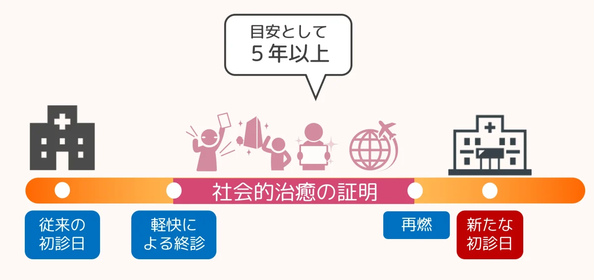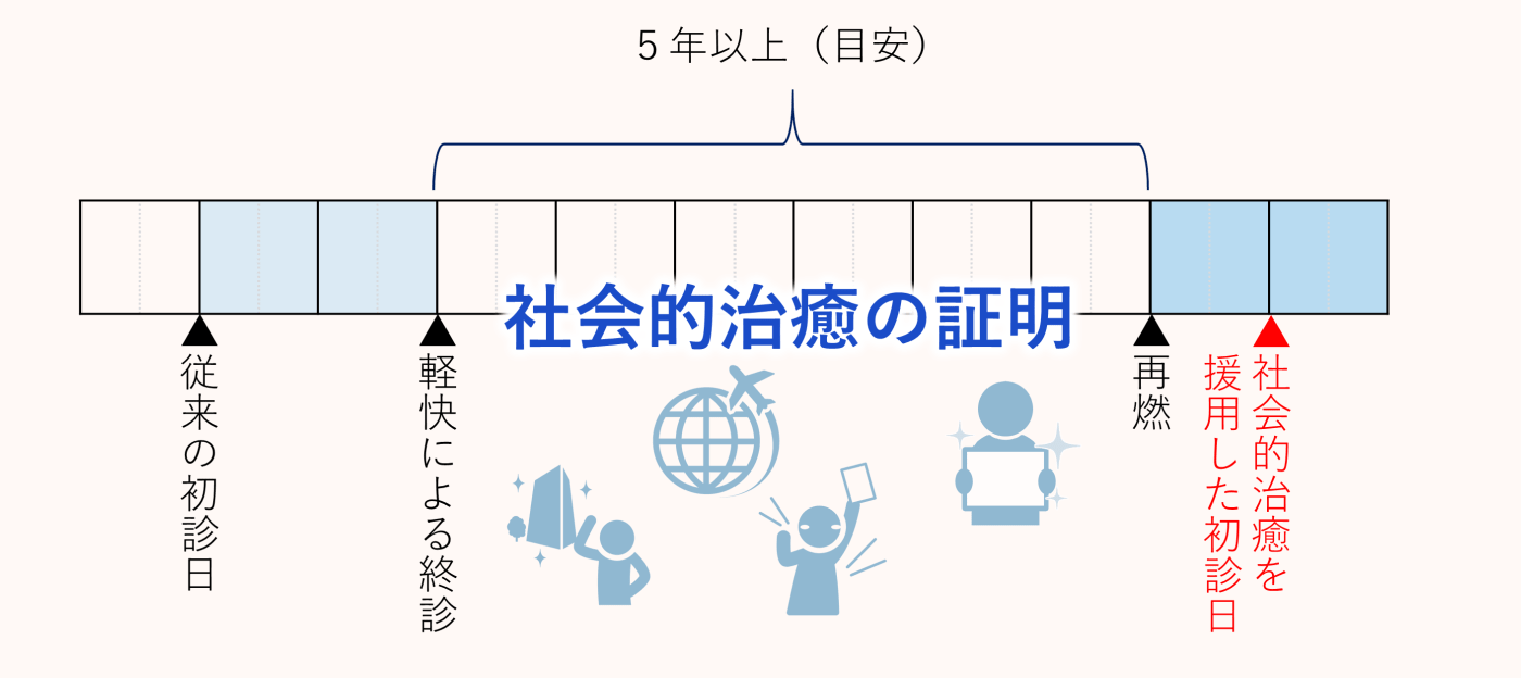 社会的治癒とは、いったん症状が軽快したあとに以前と同じ疾患が再び生じても、社会生活を行うのに問題なく過ごせていた期間が一定以上あれば、治癒したと見なし、再発した後の症状は別だとする考え方のことです。