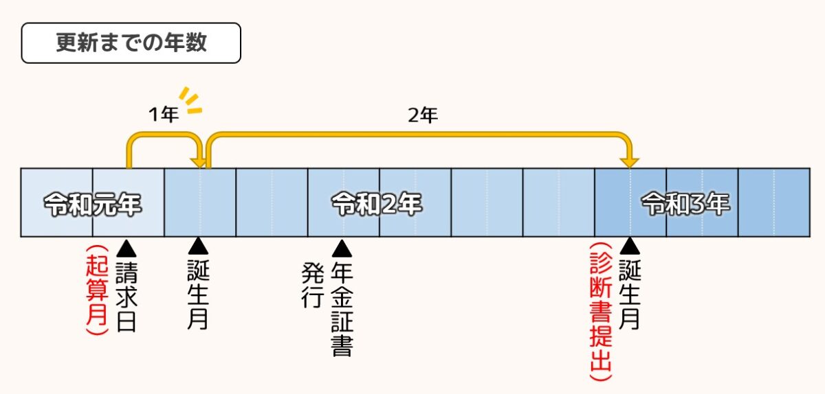 例えば1月生まれの方が、令和元年12月に請求手続きを行ったとします。次回診断書提出年月が令和3年1月となっていた場合、起算が令和元年ですから、更新までは2年ということになります。