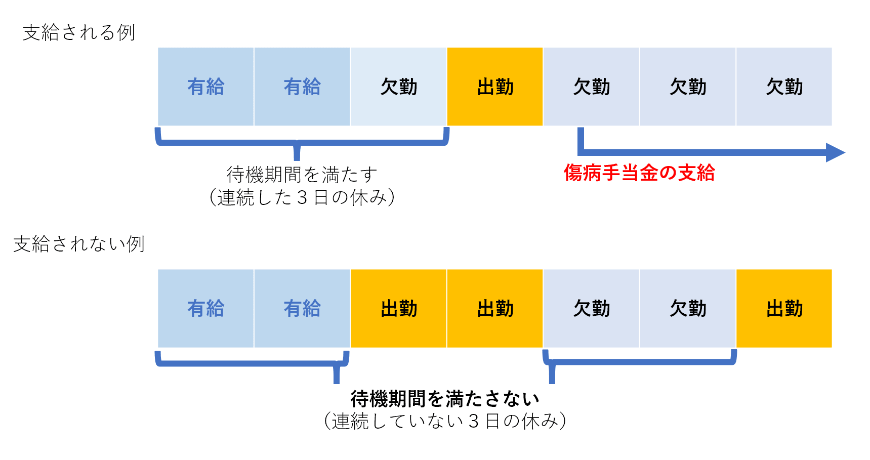 一方、傷病手当金は、傷病などで労務ができずに仕事を休んだ日から3日間が経過すれば、4日目より手当が支給されることとなります。