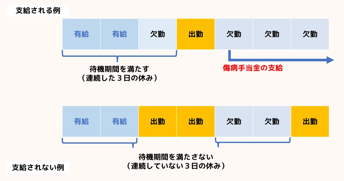 例えば、2日間休んで、3日目は出勤し、4日目から再度休んだにしても対象にはなりません。3日間の待機期間中に土日や祝日、有給などが入った場合は、休んだ日数にカウントできるので、連続して3日という解釈に含まれます。