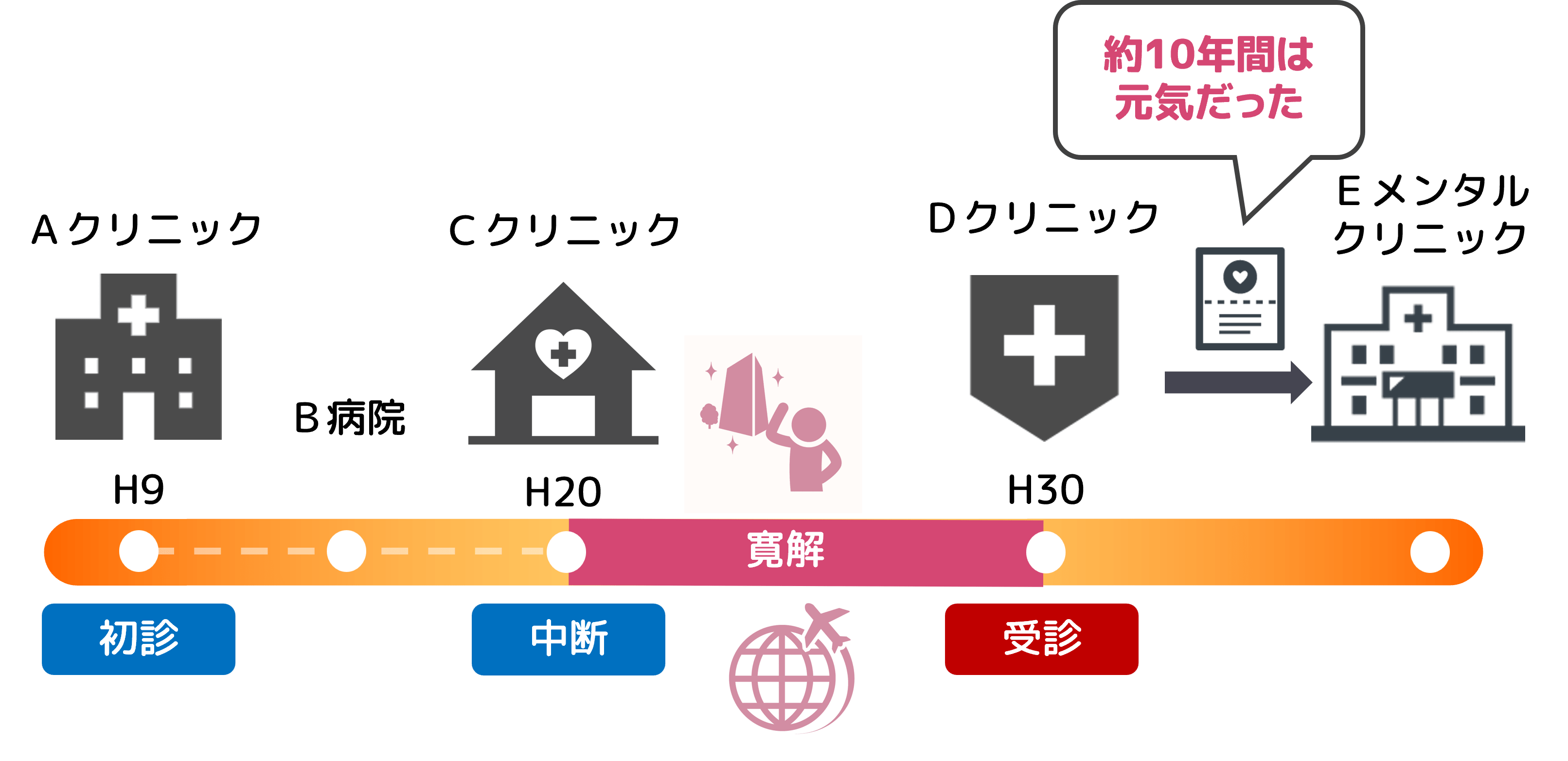 平成30年が初診日とするには、「平成30年を初診日とします」と申し立てるだけでは足りず、平成20年からの10年間の寛解状態を証明する必要があります。