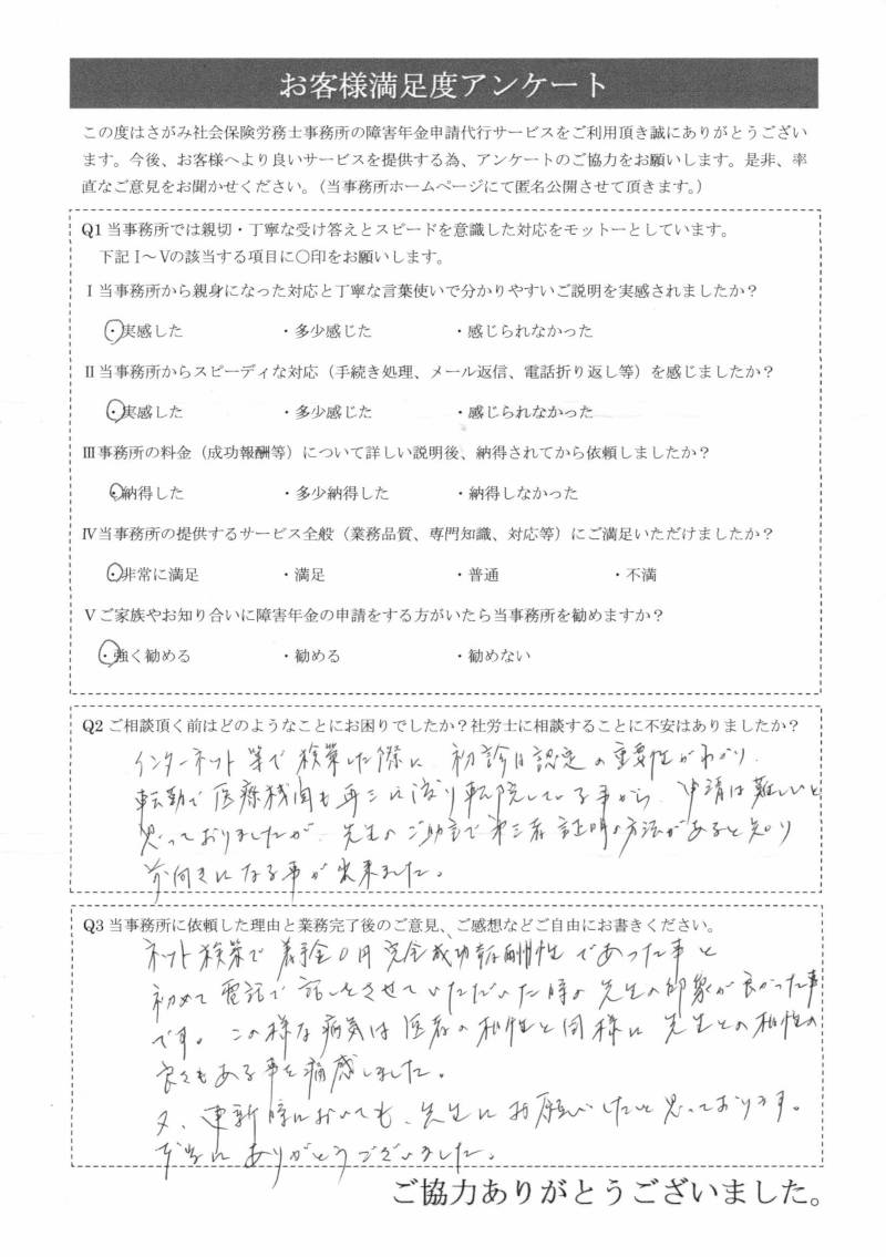 インターネット等で検索した際に、初診は認定の重要性がわかり、転勤で医療機関も再三に渡り転院している事から、申請は難しいと思っておりましたが、先生のご助言で第三者証明の方法があると知り前向きになる事が出来ました。