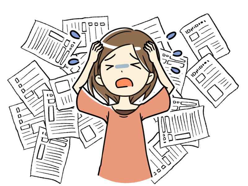 山積みの書類はじめはご自身で年金請求の手続きをしようとされていましたが、問い合わせのたびに年金事務所の担当者が代わり、初診の証明や必要な診断書の時期、その他の書類などが増え続けてしまい手に負えなくなってしまい、ご主人とともに当事務所にお越しになりました。