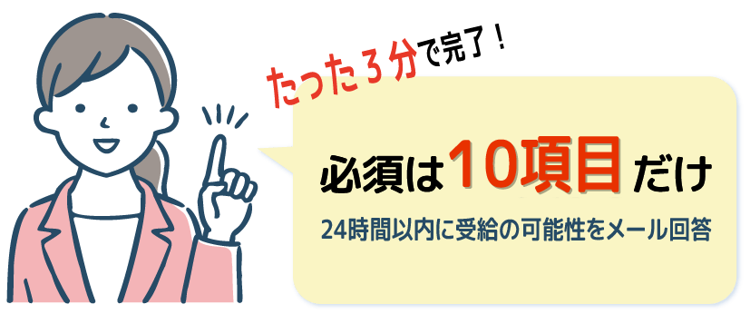 質問項目(目安時間3分)にお答えいただくだけで、受給の可能性を無料診断!